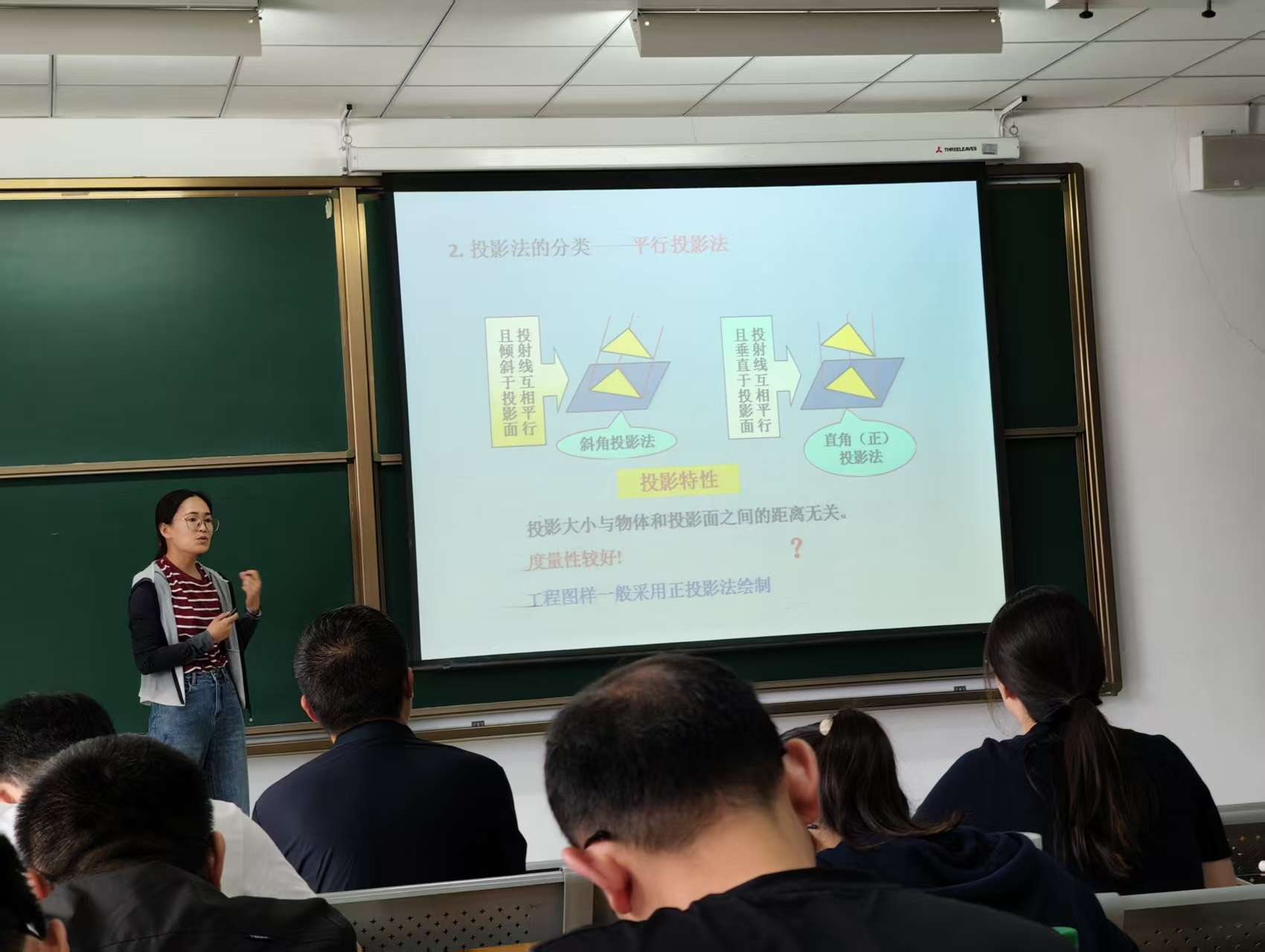 课堂上,孙老师通过生动的多媒体动画演示,深入浅出地阐述了投影理论的核心知识。“投影就像是物体在光源照射下留下的‘影子’,” 孙老师形象地比喻道,“而工程制图的关键,在于掌握‘正投影法’—— 即假设光线相互平行且垂直于投影面,从而得到能真实反映物体形状和尺寸的视图。” 这种将复杂空间关系进行科学抽象的能力,是每一位未来工程师必须具备的基本素养。她形象的比喻和通俗的讲解,使在座的每一位老师听得津津有味。