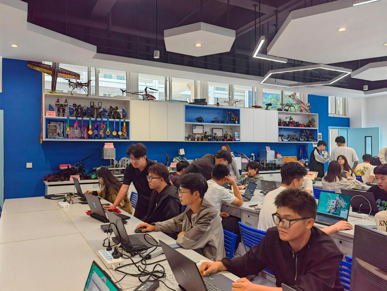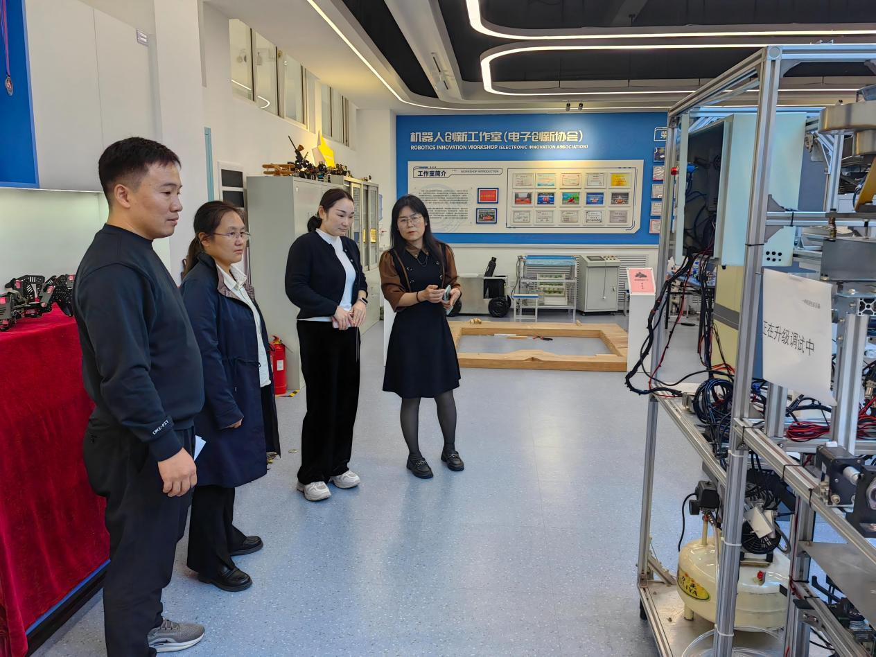 座谈会后,在李媛媛主任的带领下,调研团队实地参观了青岛黄海学院智能制造学院的创新创业中心与专业实验室。在创新创业中心基地,团队重点了解了科技创新工作室、机器人创新工作室、智能创新工作室的运行模式,以及学生竞赛组织与成果转化情况,对学院“精技善能”的培养理念给予高度认可。