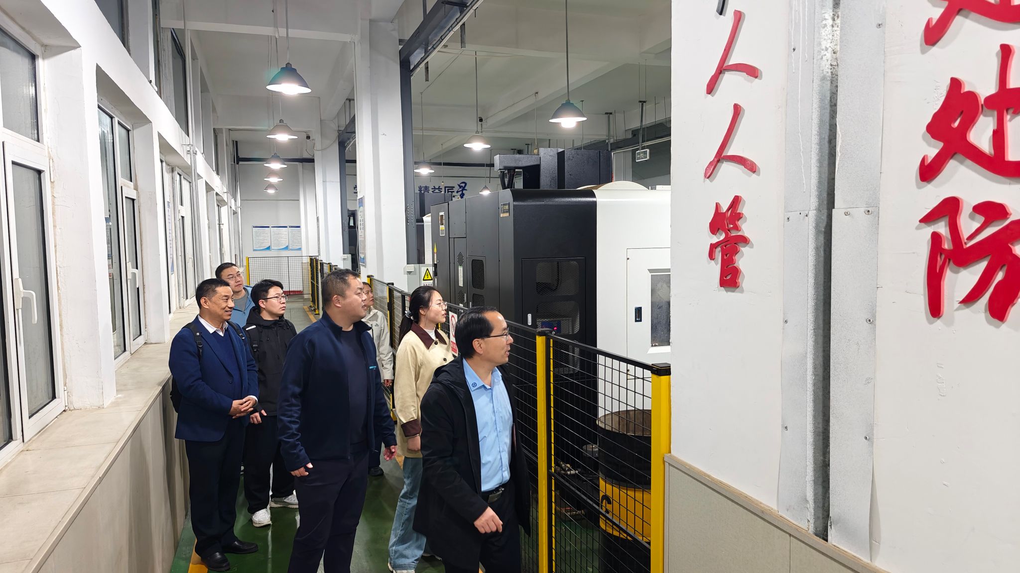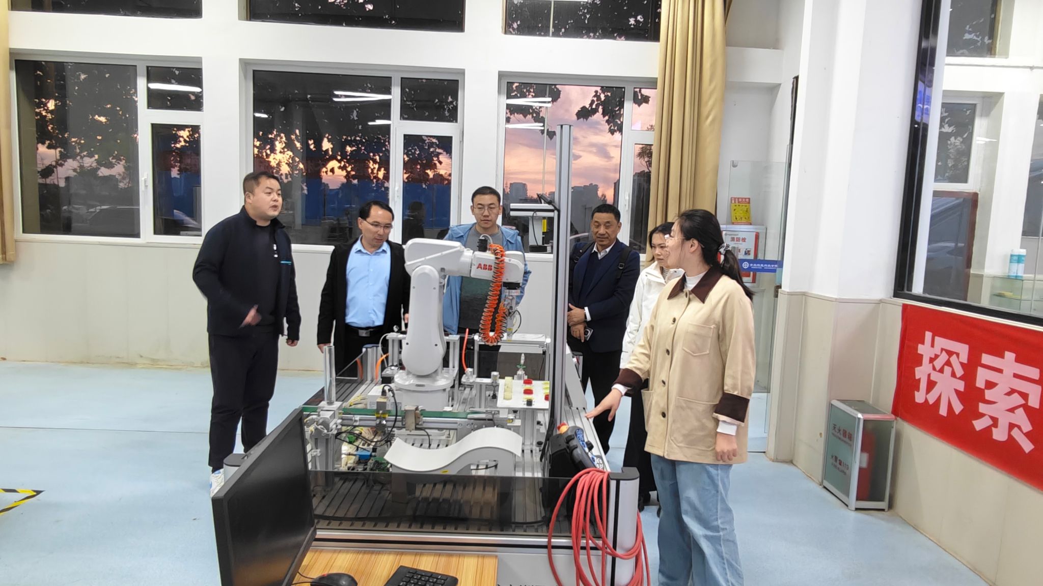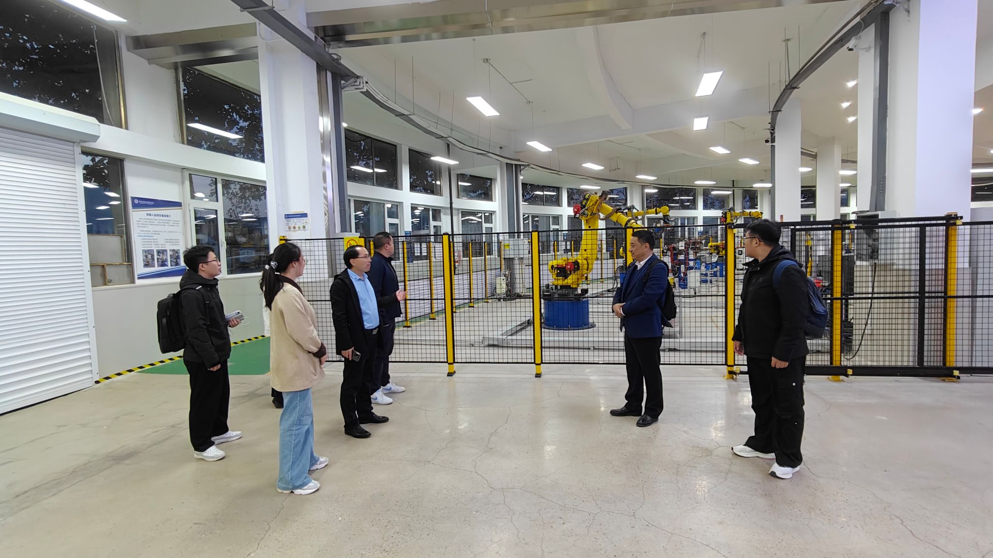 座谈会后,在机器人工程教研室主任郭金升的带领下,交流团实地参观了青岛恒星学院机械与汽车工程学院的机器人实训中心、数控加工实训基地等实践教学场所。在参观过程中,团队成员主要了解了实训基地的建设标准、设备运维管理、教学融合模式及评估期间的展示筹备方案,并对青岛恒星学院实训基地“理实一体、产教融合” 的建设模式给予高度认可。