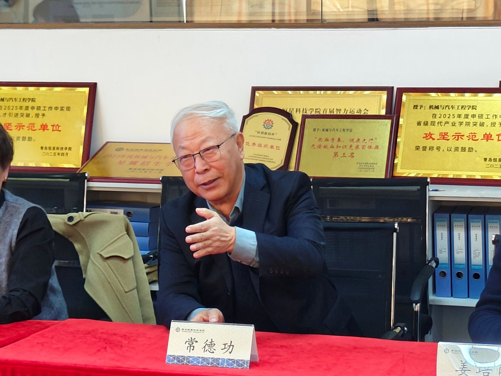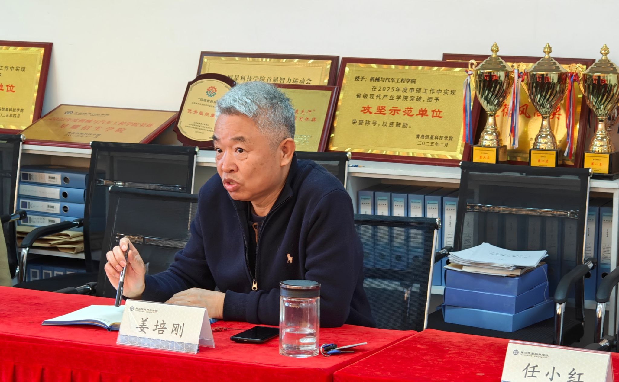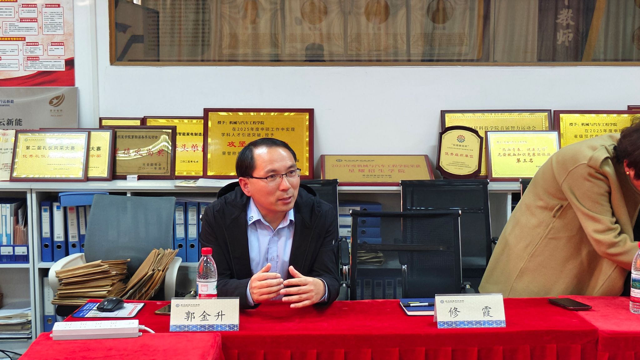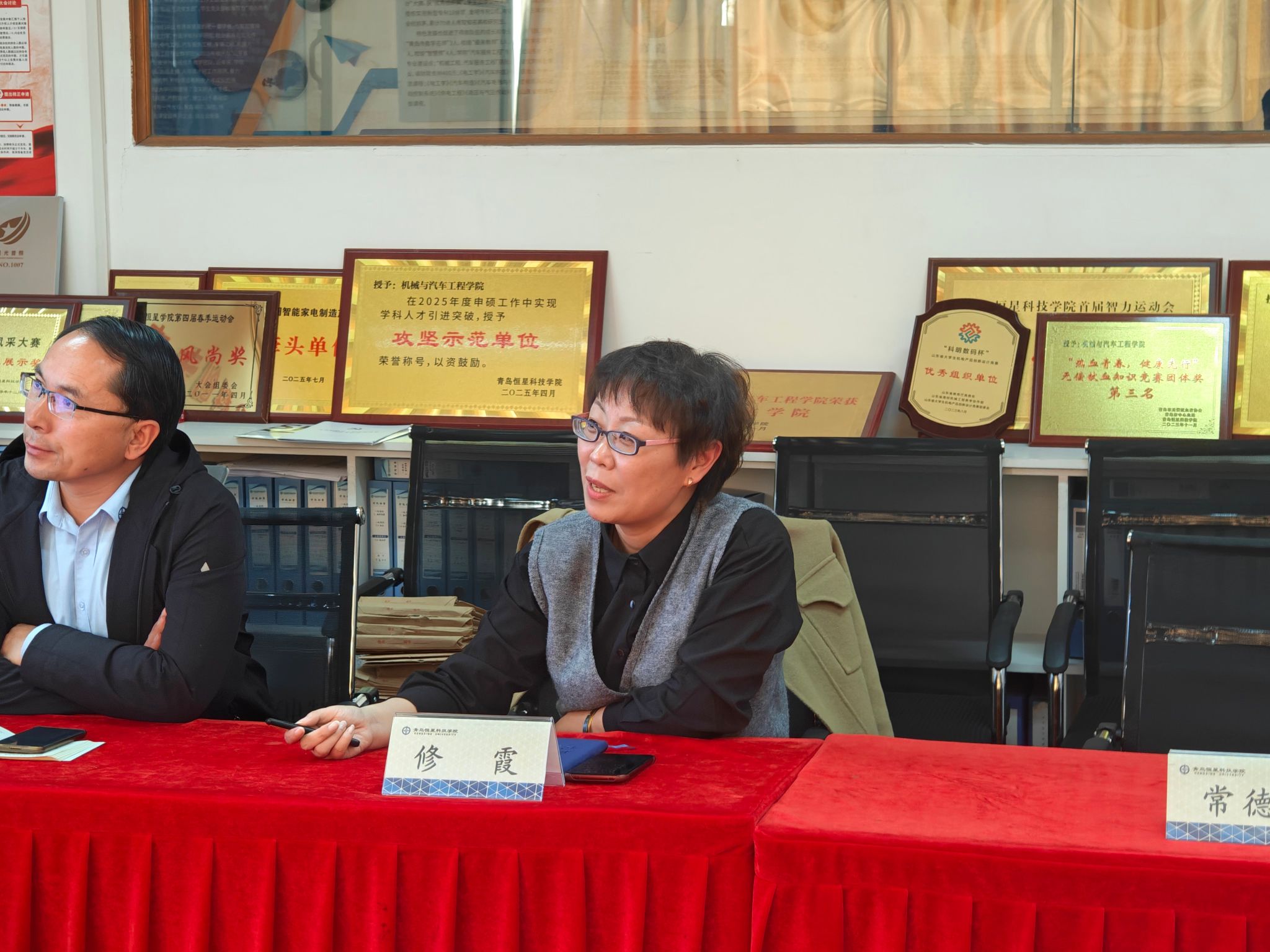 随后,双方聚焦档案规整这一核心实务展开专项研讨。青岛恒星学院机械与汽车工程学院机器人工程教研室主任郭金升现场演示了评估材料的分类标准、归档逻辑及数字化整理方法,从支撑材料的关联性、完整性、规范性等方面,结合工科专业特色,详解了实训报告、课程大纲、教师信息归档等重点档案的整理技巧,并开放档案库房供考察团实地查阅学习,为智能工程学院后续档案规范化整理提供了实操范本。