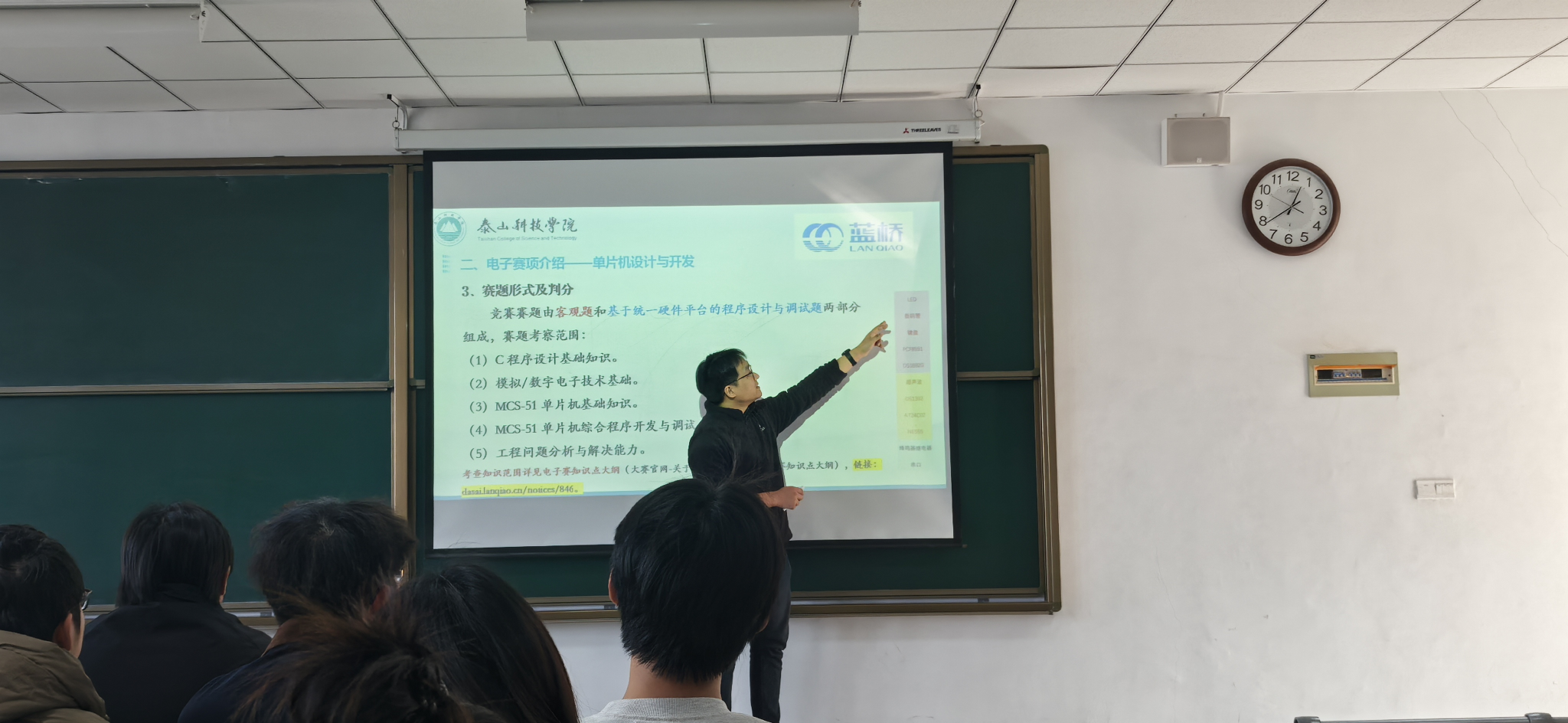 随后,孟老师重点围绕电子赛项展开宣讲,系统介绍了竞赛组别、参赛对象、竞赛形式、赛题结构及评分办法。电子赛分为大学组和职业院校组,采用“客观题+硬件程序设计题”的考核模式,内容涵盖C语言程序设计、模拟/数字电子技术、单片机开发、嵌入式系统应用及工程问题解决能力等多个方面。竞赛采用封闭限时方式进行,全程禁止访问互联网,强调选手的独立开发与实时调试能力。同时,孟老师根据大家目前不同赛道的训练现状,给予了不同的建议,明确了同学们当前学习阶段的任务。最后宣讲环节中,孟珩老师为现场的参赛学生和指导教师介绍了“蓝桥杯”大赛报名所要准备的材料及报名的方式,孟老师从大赛平台的注册、学生身份及院系认证、报名信息提交等方面进行了介绍。