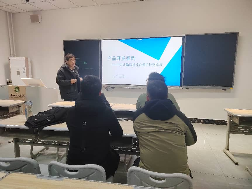 培训伊始,李英建教授没有急于抛出复杂的技术理论,而是以带式输送机综合保护控制系统这一实际案例为引,开启了一场深入浅出的经验分享。他先从系统整体架构入手,讲述如何根据煤矿井下防爆场合的特殊需求,合理规划监控主站、分站等各个模块的功能与布局,让青年教师们对产品开发的全局有了清晰认知。