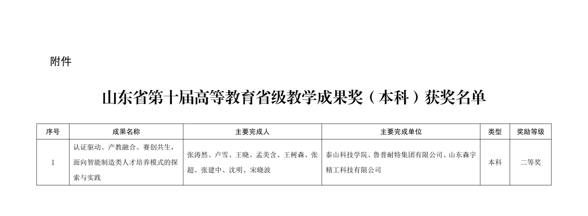 日前,山东省教育厅正式公布第十届高等教育省级教学成果奖获奖名单。泰山科技学院作为第一完成单位申报的教学成果《认证驱动、产教融合、赛创共生,面向智能制造类人才培养模式的探索与实践》荣获二等奖(本科类)。这一成果的取得,是学校多年来深耕学科竞赛、深化产教融合、聚焦应用型人才培养的集中体现,也是学校在智能制造人才培养领域的又一重要突破,彰显了学校办学特色与育人成效。